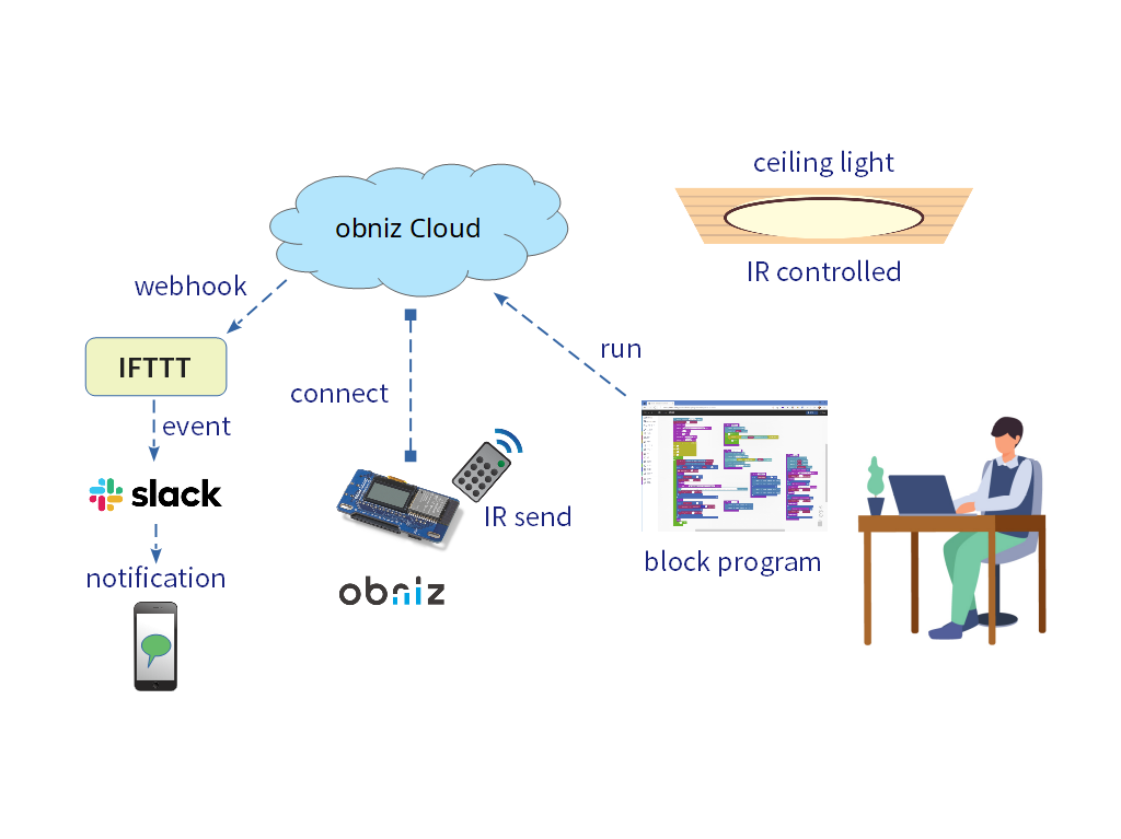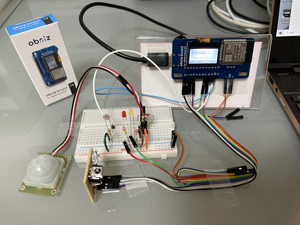 - 本システムの前提として、作業中はPCが立ち上がっていているかつ、ブラウザでObniz Cloudの画面を開いてObnizのプログラムを実行し続けることとしています。