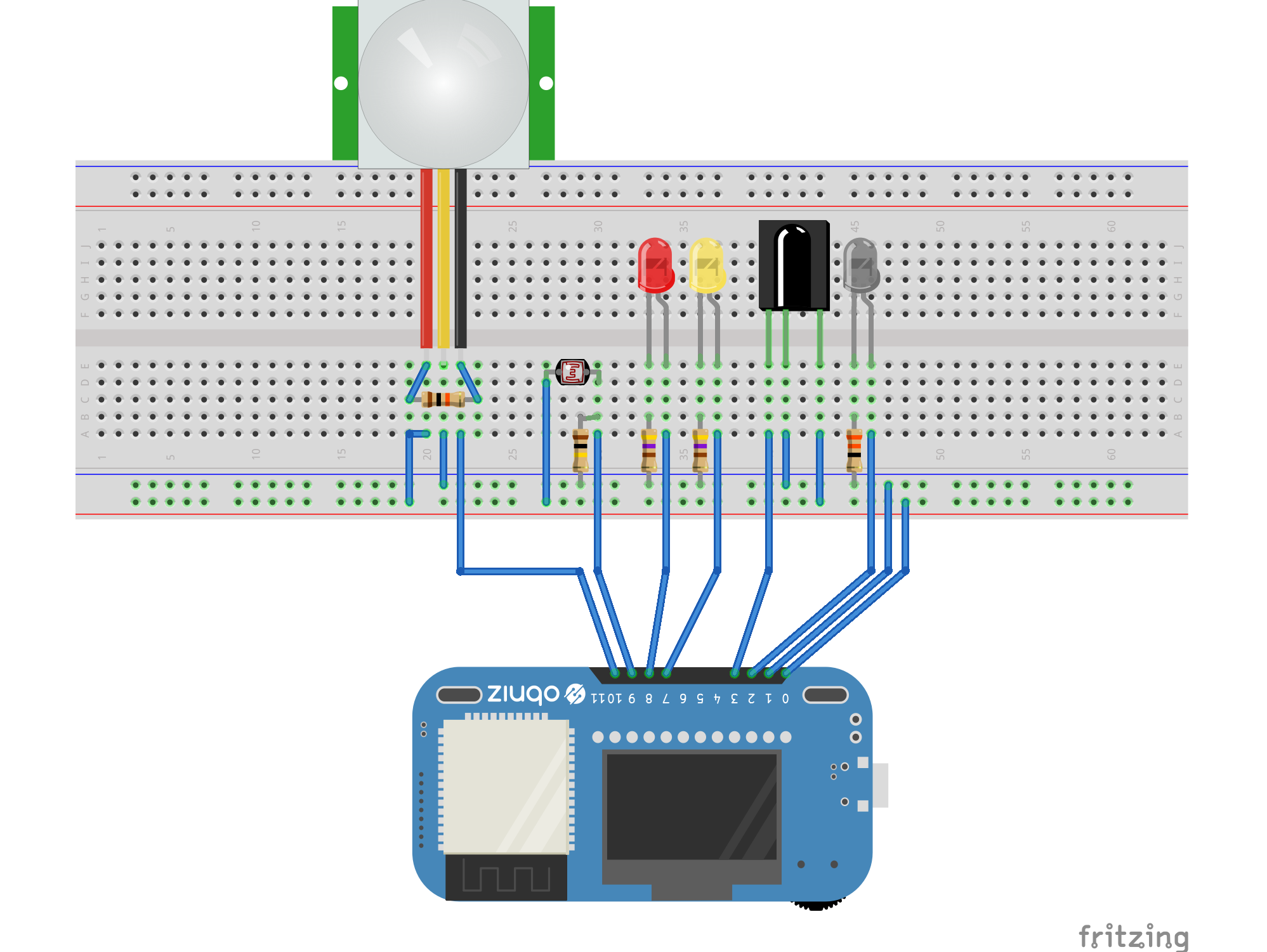 すべて繋いだ状態です。ツールの都合上PIRセンサーの黄色は実際は白色になります