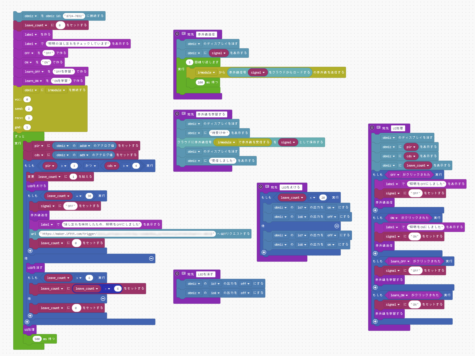 - 変数leave_countの値をインクリメントして 30 (15秒相当) になったら消し忘れと判断し、照明リモコンのOFF信号を赤外線で送信します