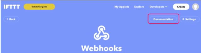 - Webhooksのページ (https://ifttt.com/maker_webhooks) を開き、Documentation を開きます