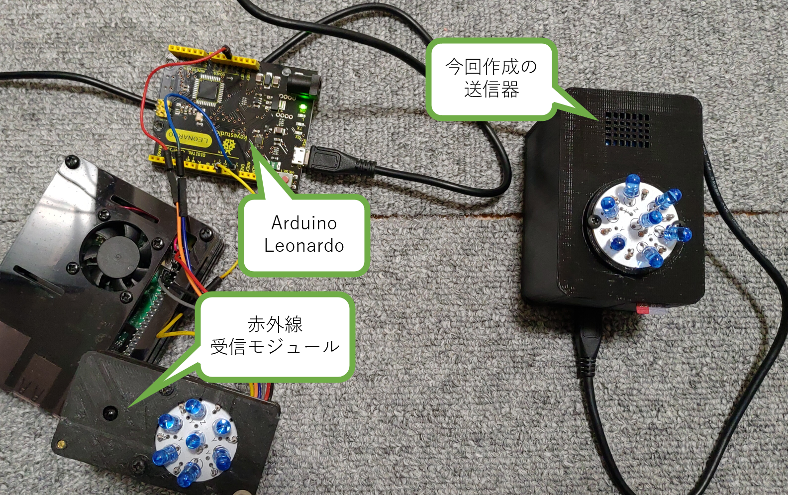 ArduinoのIRremoteのサンプル、IRrecvDumpをそのまま利用して、Arduino Leonardoで今回作成したデバイスの送信コードを受信してみます。実験結果は下の通りで、NECのコードは一致し、Rawのコードはタイミングが少々違いますが、赤外線リモコンとしては許容範囲であると思います。(受信ICは秋月のSPS-442-1です。)
