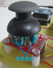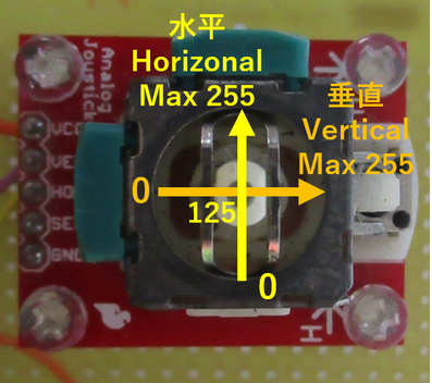 ⇓図のように,縦方向・横方向それぞれに操作したときの操作量を読み取るため,可変抵抗と呼ばれる電子部品が2つあります.