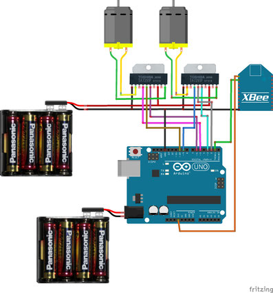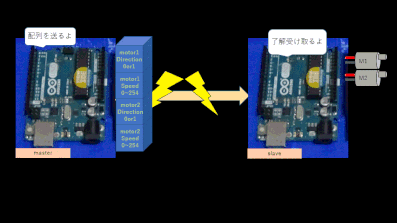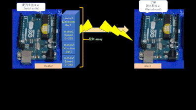 ②計算した後は,スレーブ側のArduinoへ数値を送って,モータの速度を調整しつつロボットが動く.