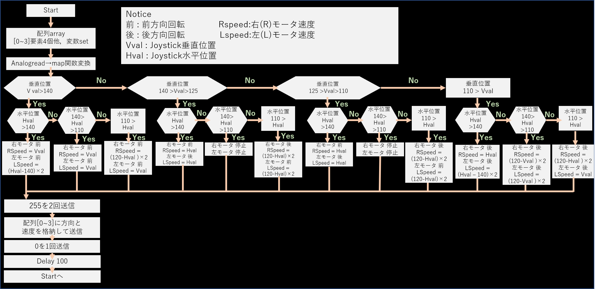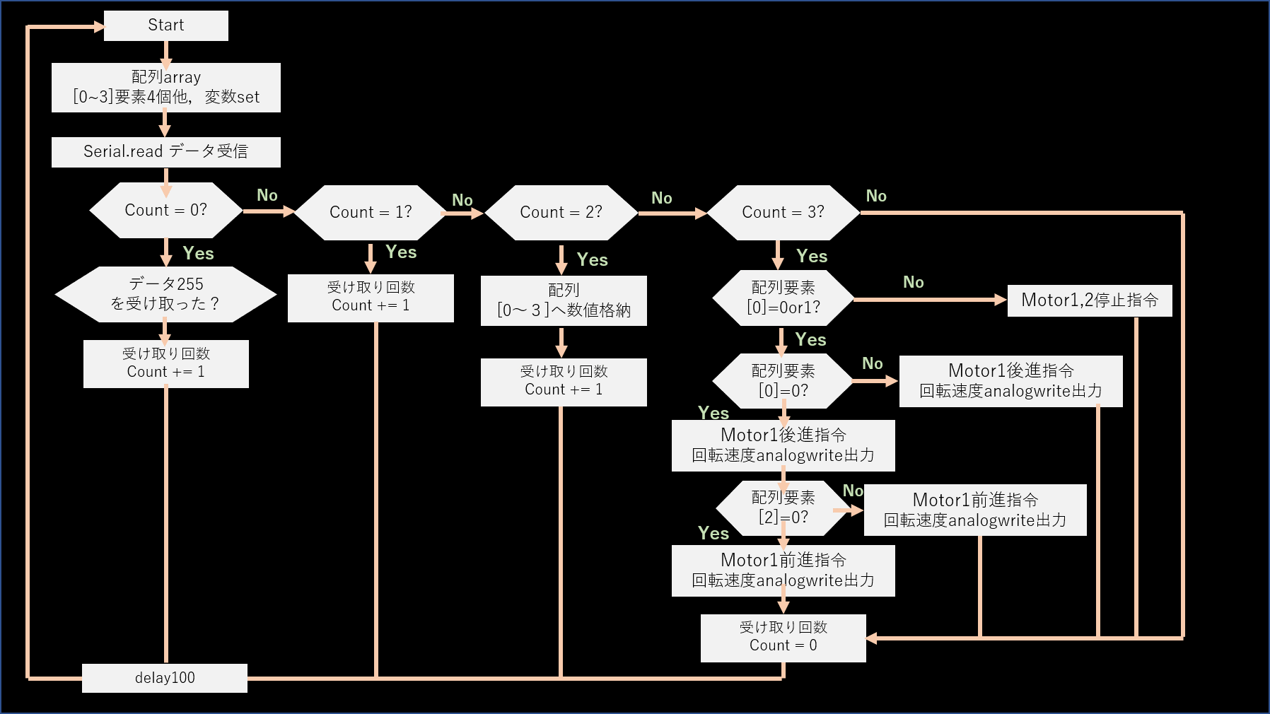 また,今回のモータ回転速度の最大値は254としていて,「データ開始」の数値と重ならないようにしています.