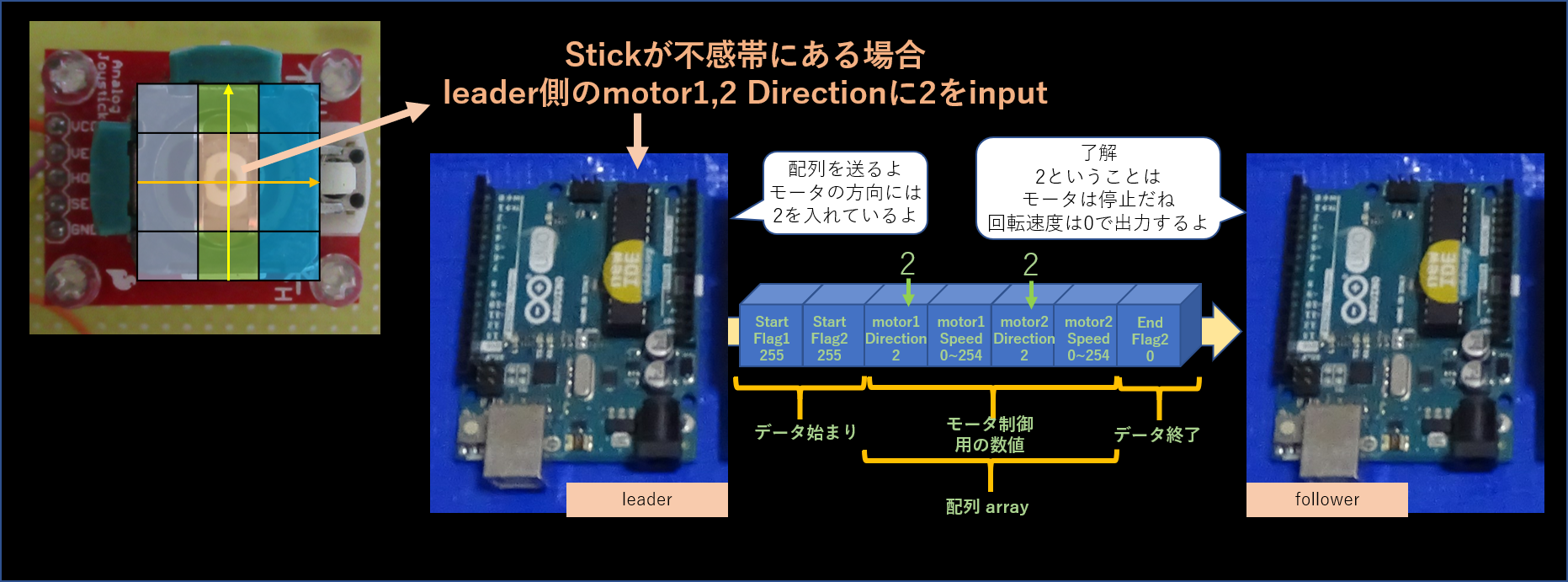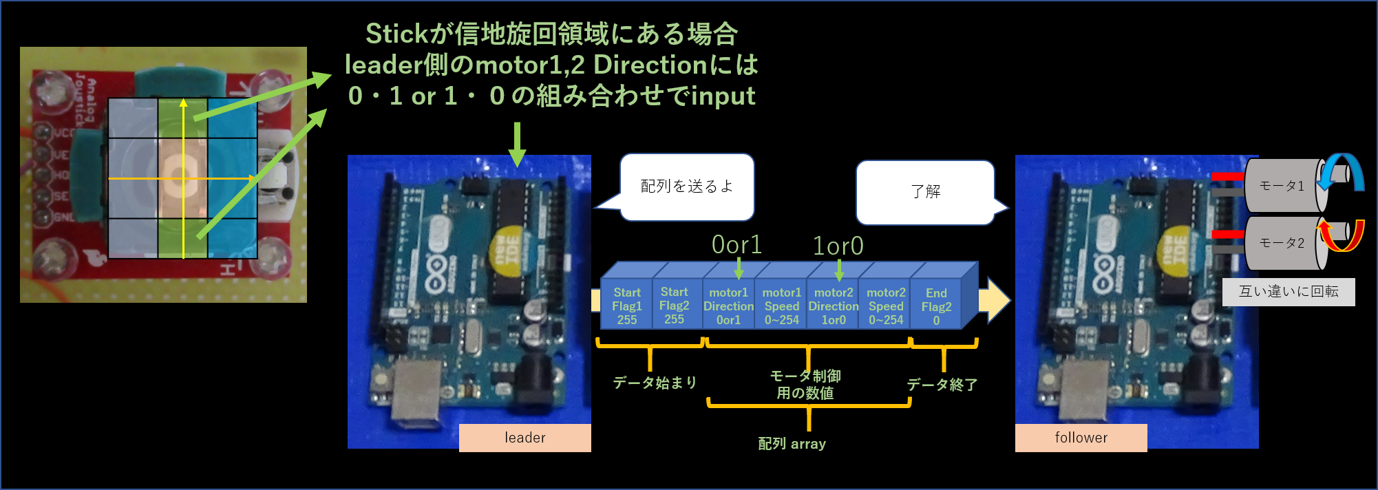 送信側Arduinoでは,モータの回転方向の配列に2を格納して受信側へ送信.