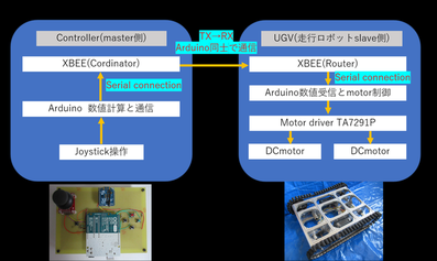 ①送信側のArduinoが,オペレータのジョイスティックなどの操作量を読み取って,