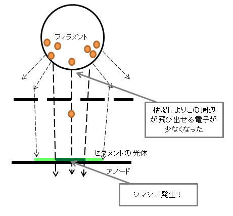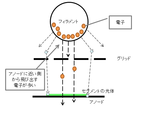 熱電放出により、被覆の外層は時間の経過とともに電子が枯渇します。そしてフィラメントのアノードに最も近い側はより早く電子が枯渇します。