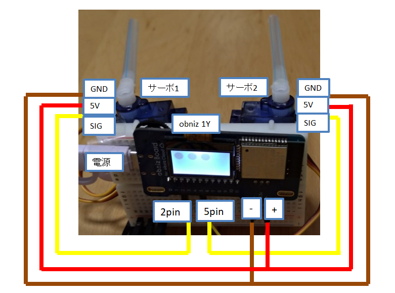 | ブレッドボード | 1 | 手持ちできるようにobniz、サーボ、電池ボックスをはりつけて、配線しています。 |