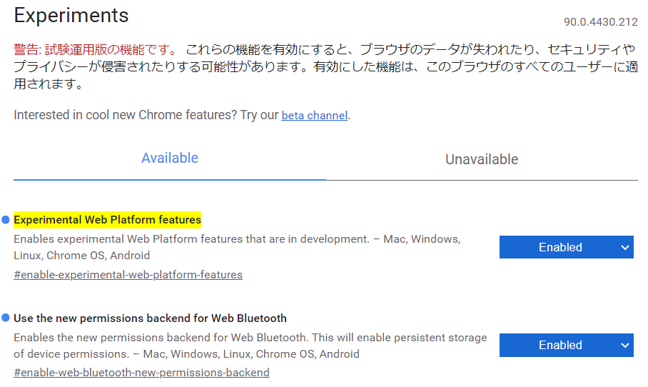 Web Bluetooth APIのscan機能を利用しているため、Chromeブラウザの試験的な機能を有効にする必要があります。