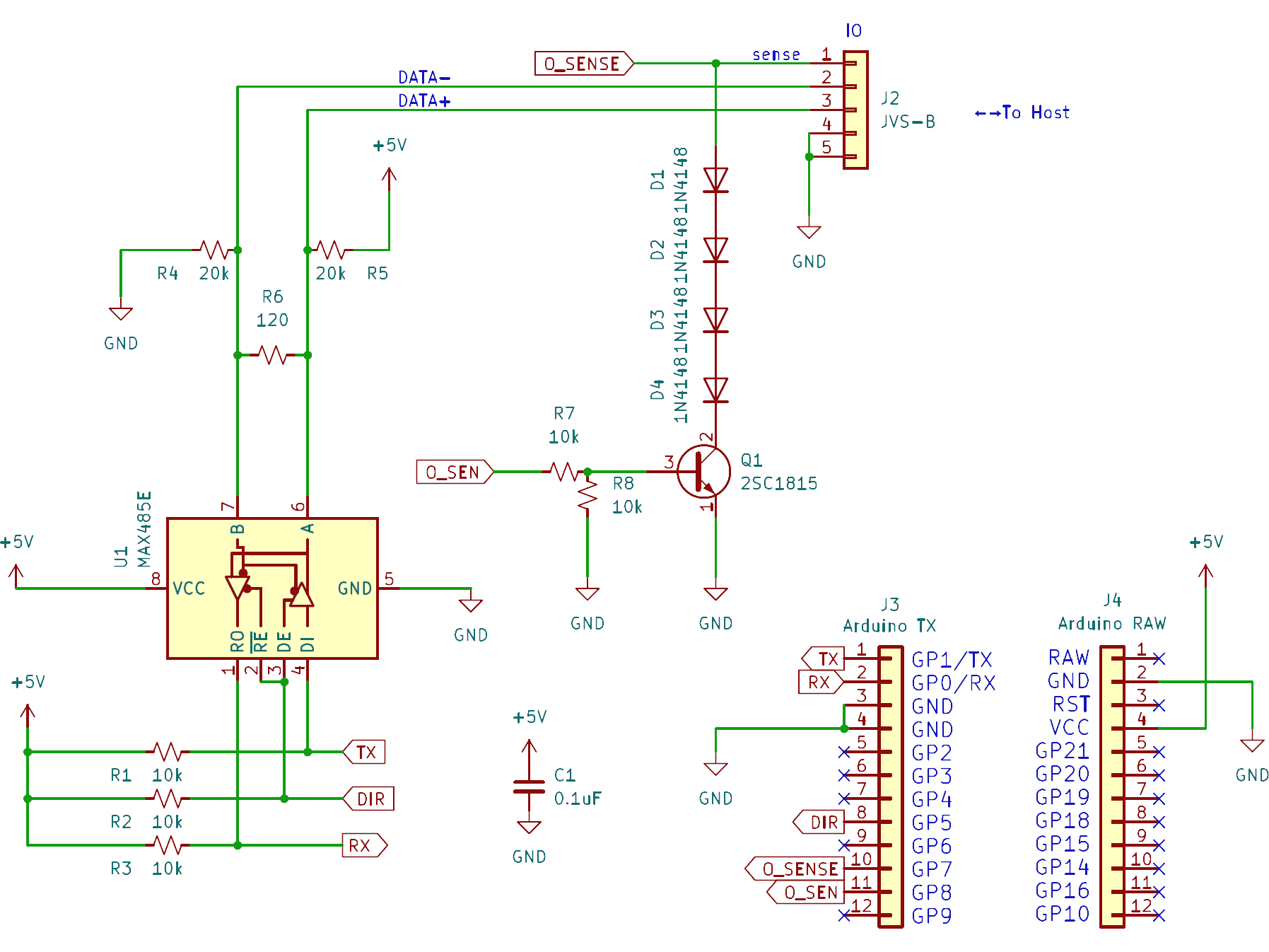 JVSは電気的にはRS485というシリアル通信になります。+/-の作動信号1ペア+接続検出信号+GNDの4芯です。半二重通信です。