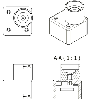 このままだと、宝石(小さい・高価)の透過光をうまくセンサに当てることができないため、宝石を置くトレーや外装を3DCAD+3Dプリンタで作成します。参考までに、今回作成したケースの三面図を下記に示します。
