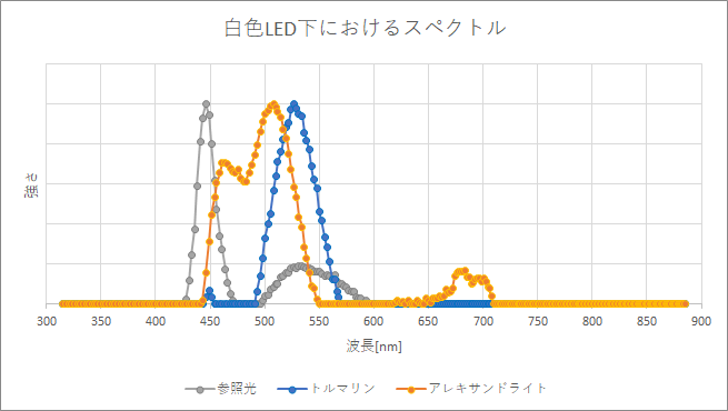 次に、白色LED下で緑色の石(トルマリン・アレキサンドライト)を判別してみます。白色LED下でトルマリンとアレキサンドライトを測定すると、下記のようなスペクトルを示します。