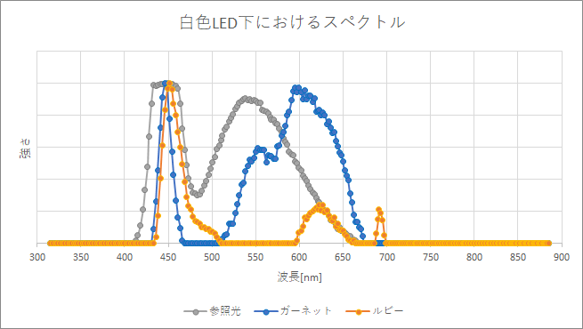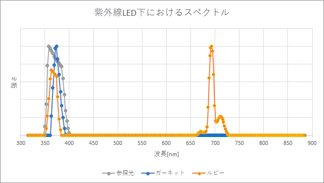 まず最初に、赤い石(ルビー・ガーネット)を判別してみます。これらはともに赤い石ですが、ルビーの赤い色を生む原因であるCr3+の特徴から、判別することができます。すなわち、ルビーは下記に示す2つのグラフの通り、白色LEDや紫外線LEDを当てた時、690nm付近にピークが存在するという特徴を持っています(参照光には含まれない波長の光です)。