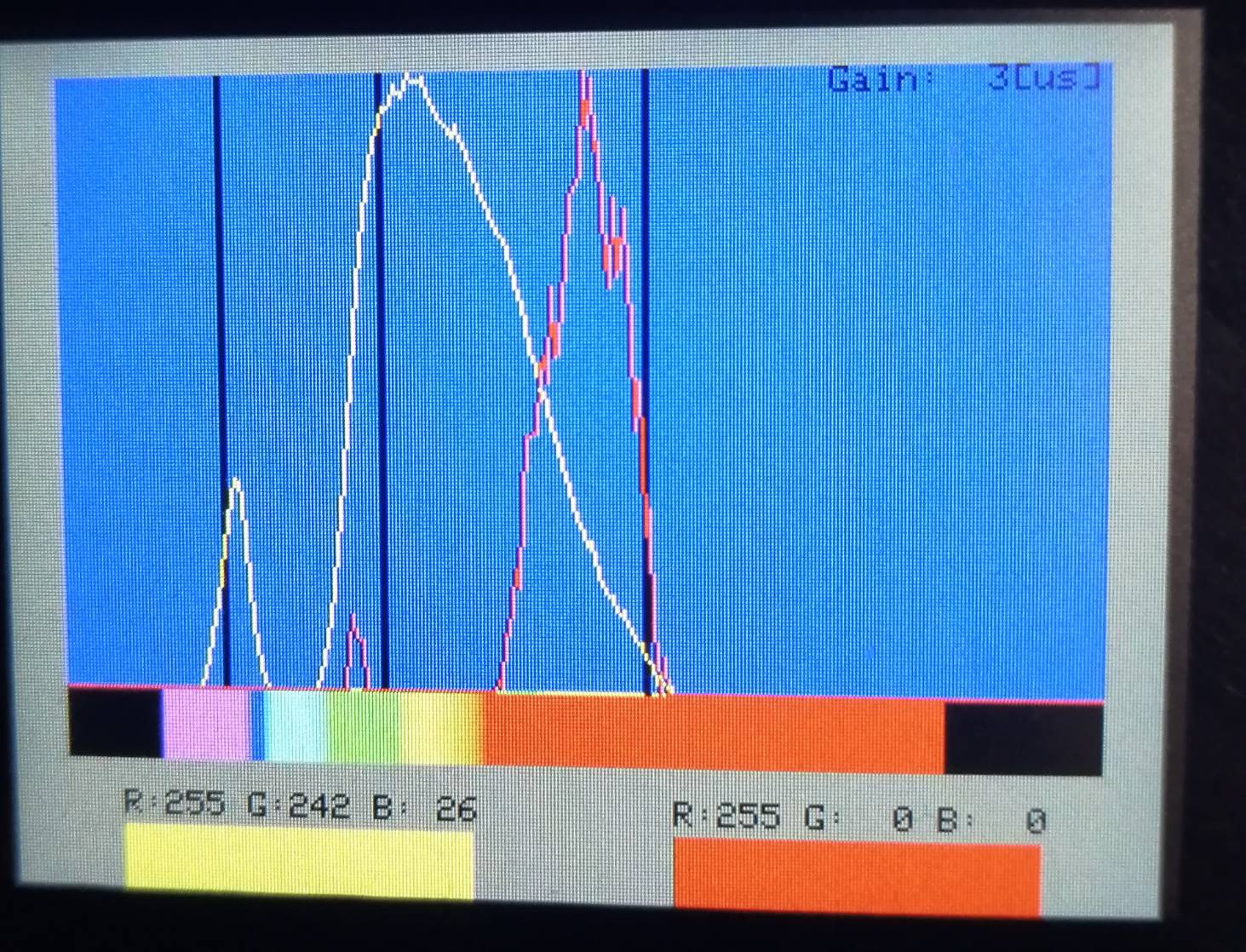 作成した分光光度計は、2種類のスペクトルを表示できるようになっています。M5StackのAボタンを押すと参照光(光源の光)、Cボタンを押すと宝石を透過した透過光の測定を行います。画面には、常にこの参照光と透過光のスペクトルが表示されます。下図は、電球色のペンライトでアレキサンドライトを測定した時のM5Stackの画面です。画面左下に黄色い四角が表示されていますが、これが参照光(電球色のペンライト)の色を表しています(R:255、G:242、B26と、黄色っぽい光であることが分かります)。また、画面右下に表示されている赤い四角は、宝石を透過した透過光の色を表しています。画面上部のグラフは、参照光・透過光それぞれの測定値(スペクトル)をグラフで表示しています。