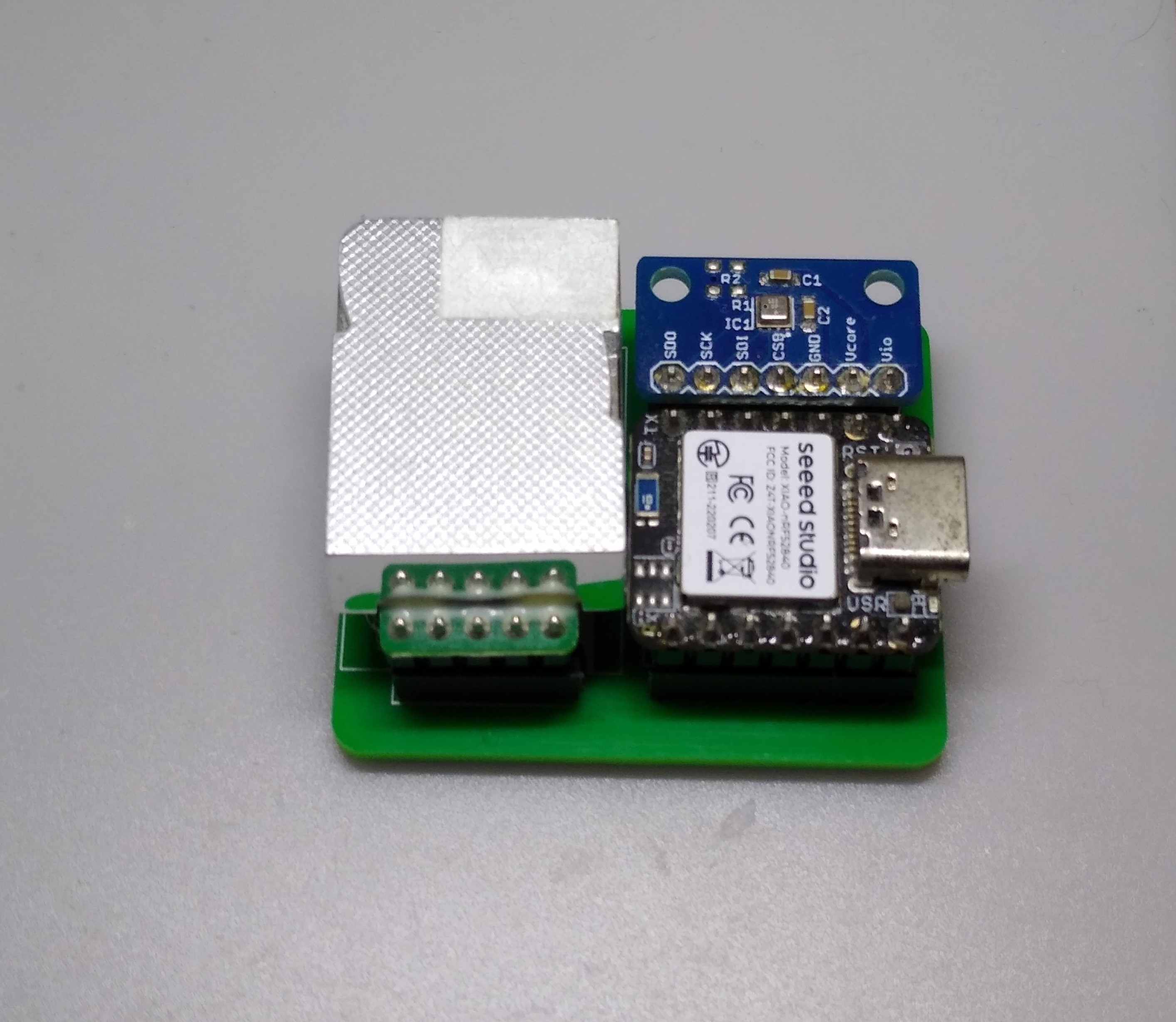 左側がCO2センサ、右上がBME280、右下にXIAO BLEです。ちょっと密着しすぎましたかね。