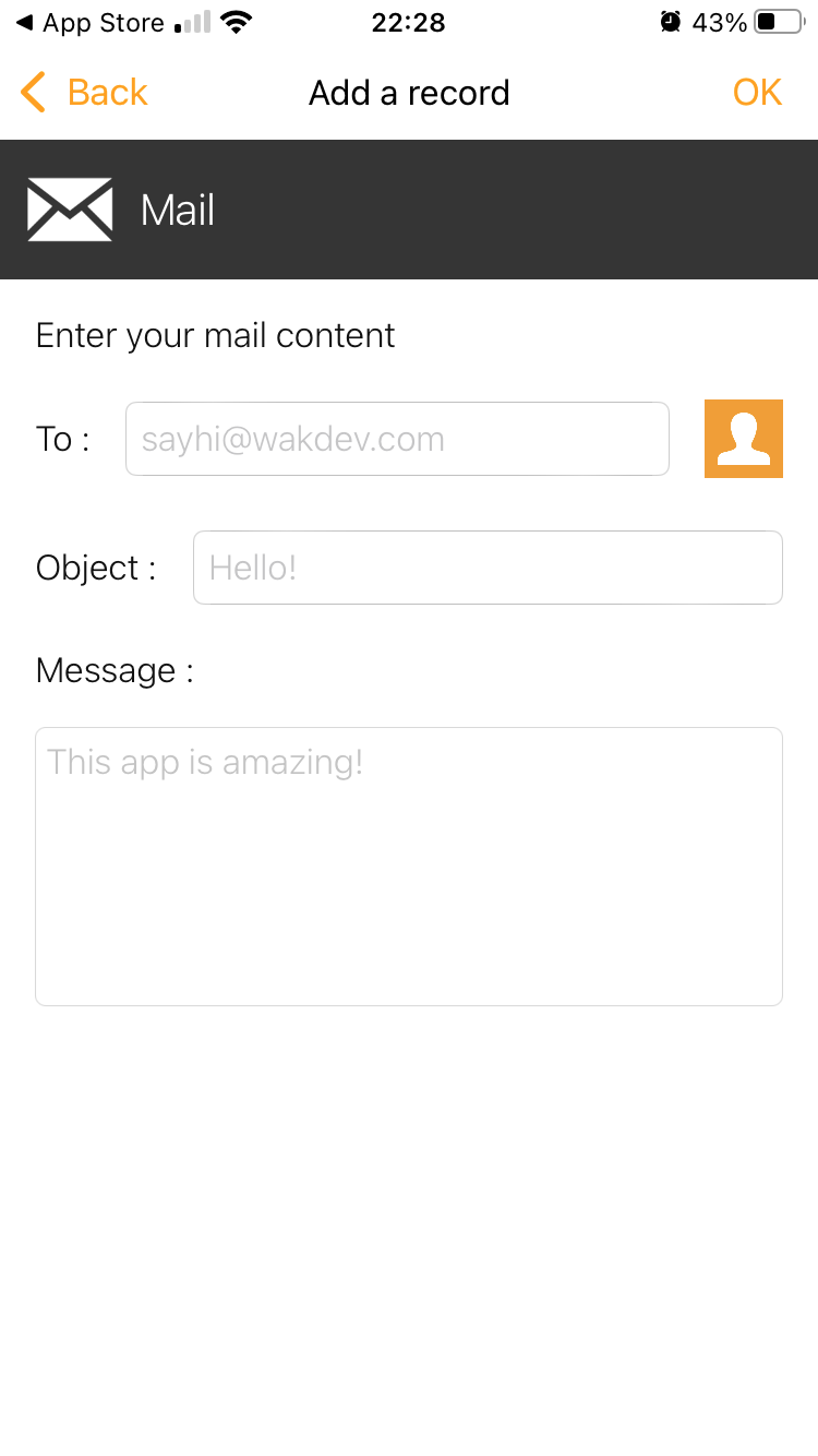 宛先、件名、本文を設定できる。宛先以外は記入しなくてもよい。