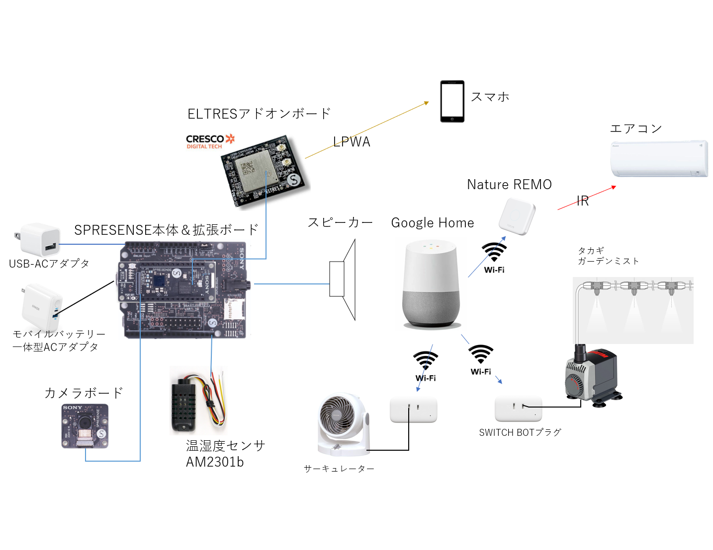 それぞれのON/OFFはSPRESENSEに接続されたスピーカーからの音声指示をGoogleHOMEが認識し、