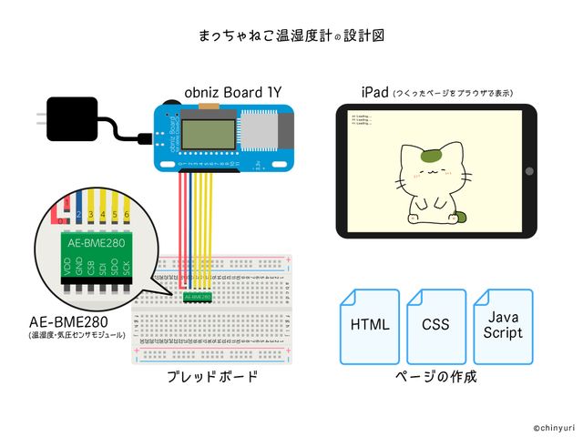 設計図通りにobniz Board 1Y、ジャンパワイヤ、ブレッドボード、AE-BME280を組み合わせます。