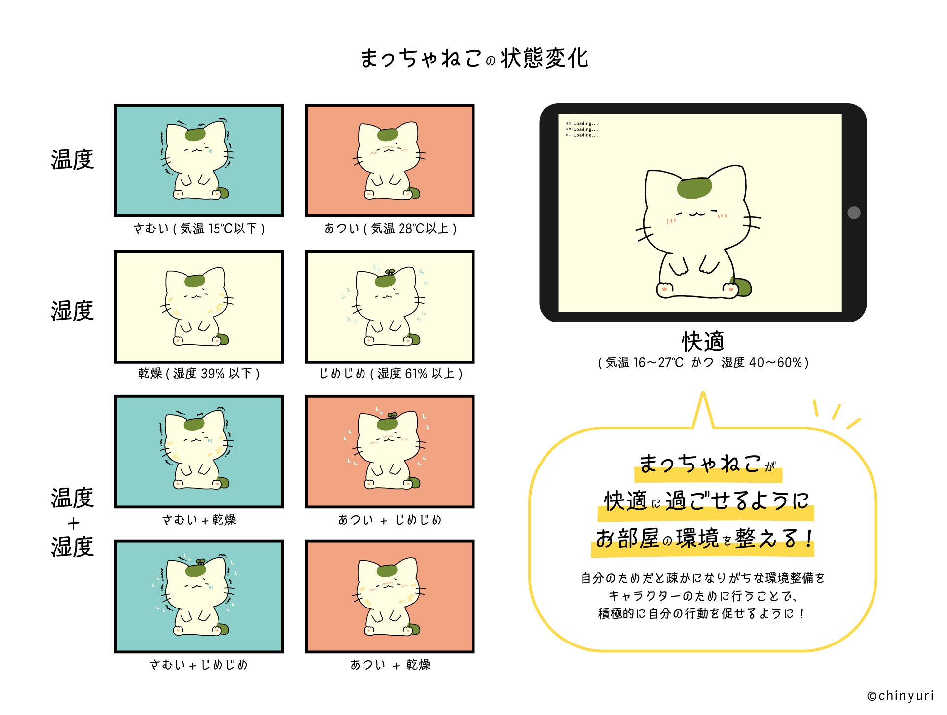 環境に応じてオリジナルキャラクター「まっちゃねこ」の状態が変わり、