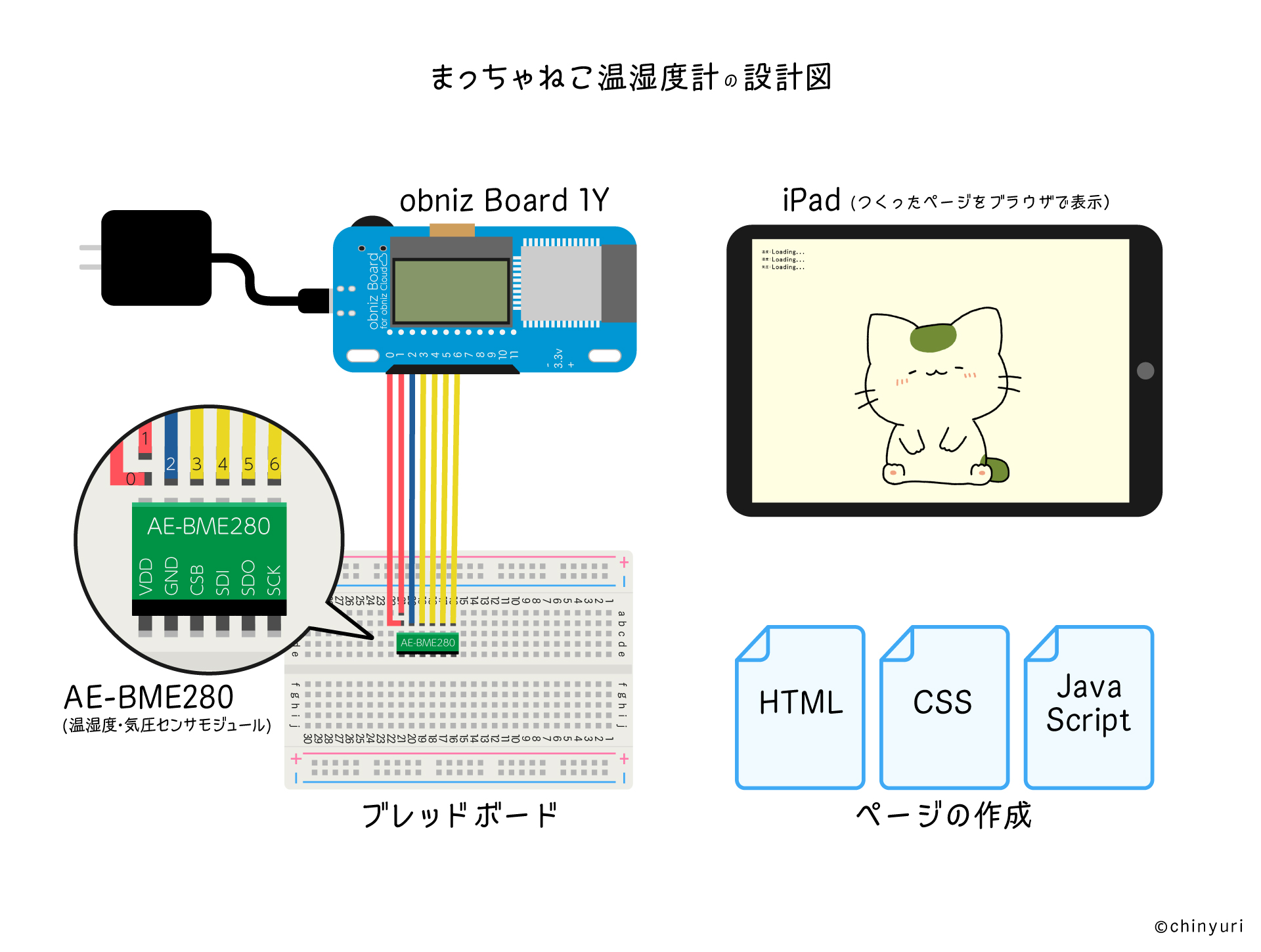 設計図通りにobniz Board 1Y、ジャンパワイヤ、ブレッドボード、AE-BME280を組み合わせます。