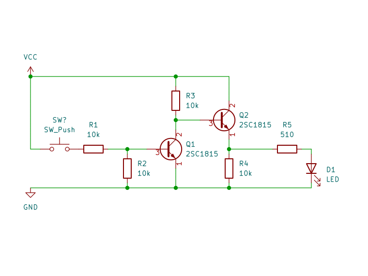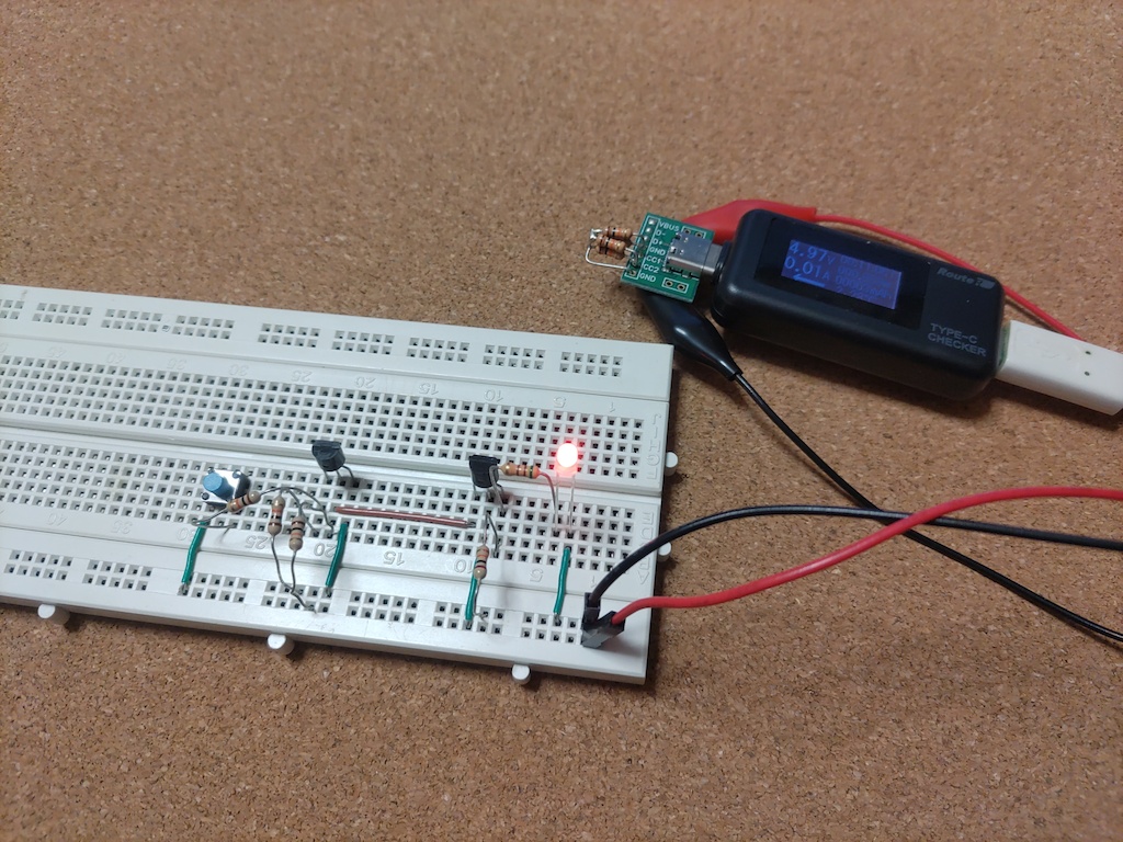 トランジスタの足配置を参考にすれば、今回の回路は例えば以下のようになるだろう。
