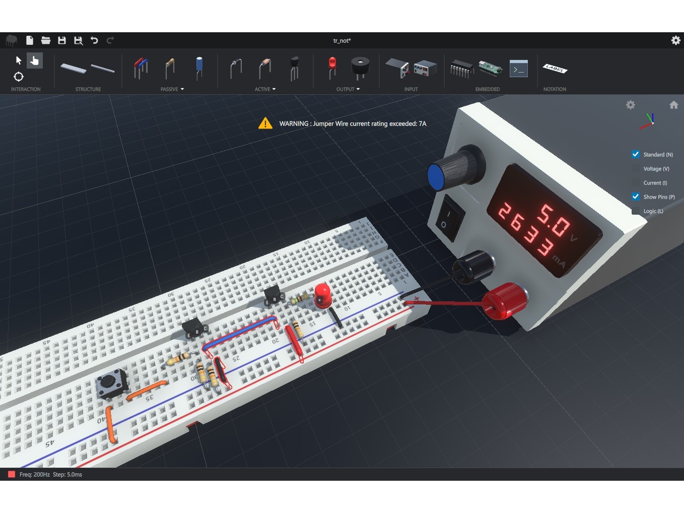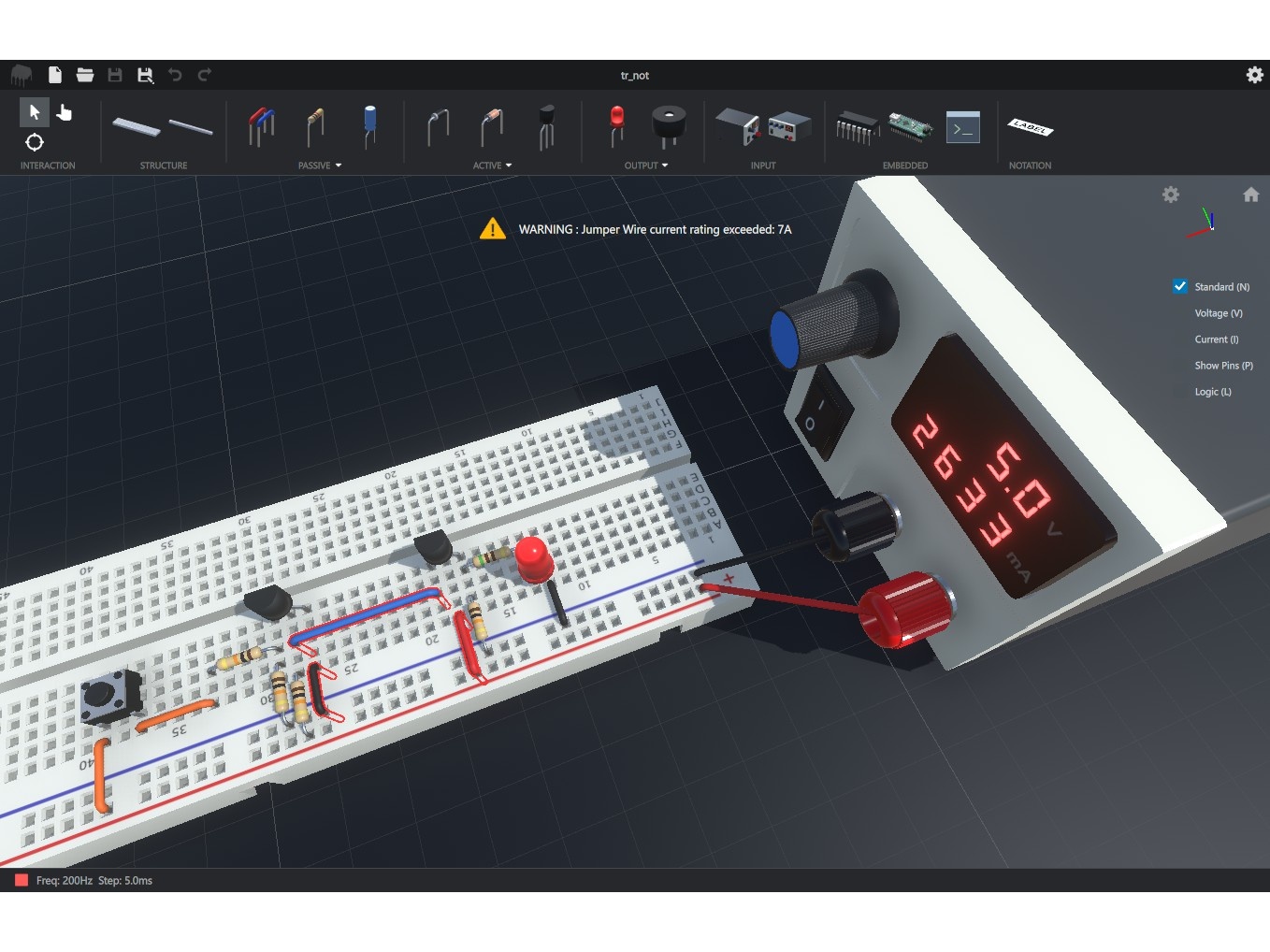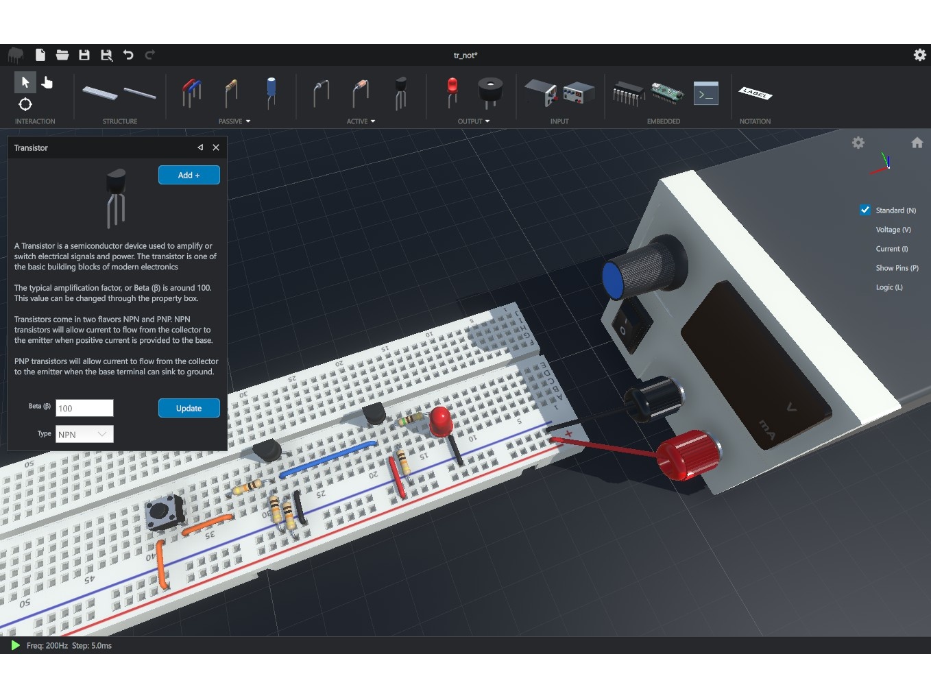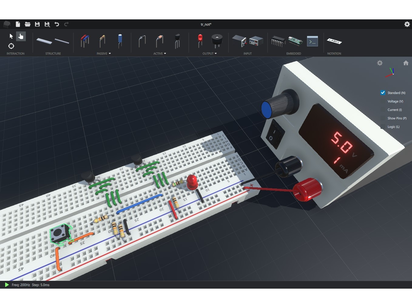 回路図ではなく、ブレッドボードや部品の3Dモデルを配置して回路を作成する。