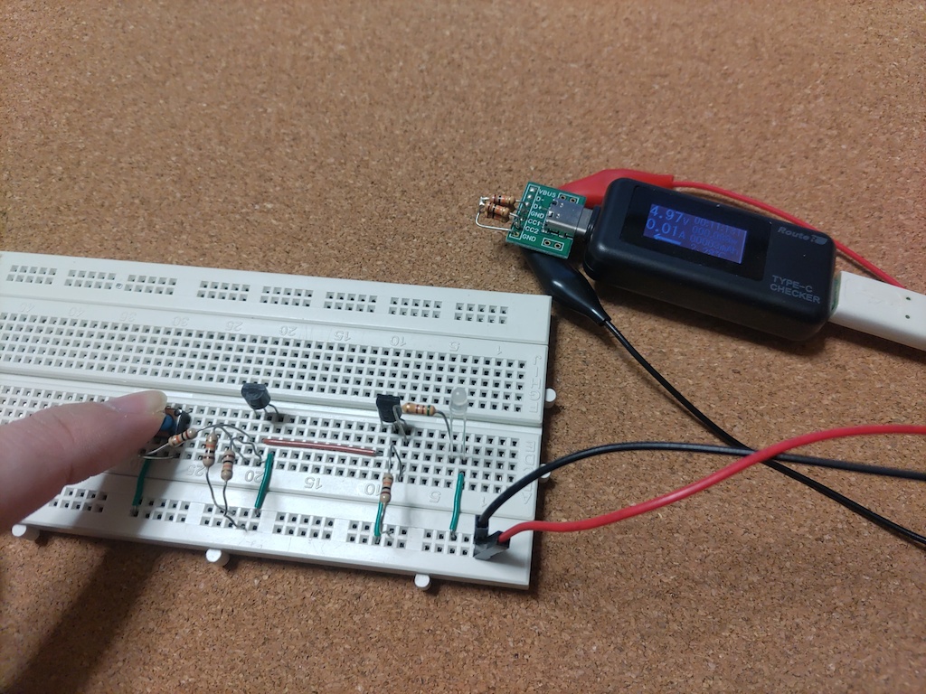 実際のブレッドボードや部品を用い、同じ回路を組んでみた。