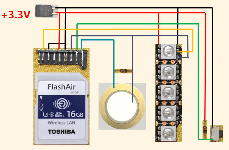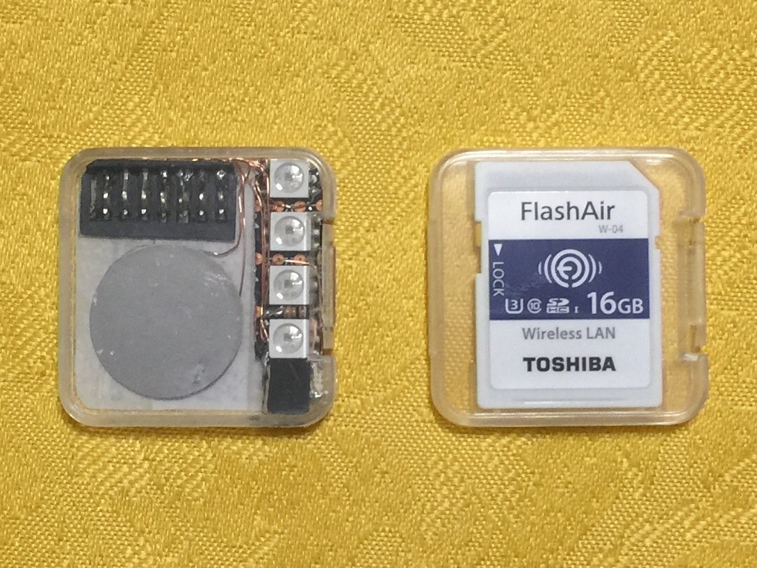 部品をポリウレタン線でつなぎ、FlashAirを購入した時に入ってくるプラケースの中に収めます。
