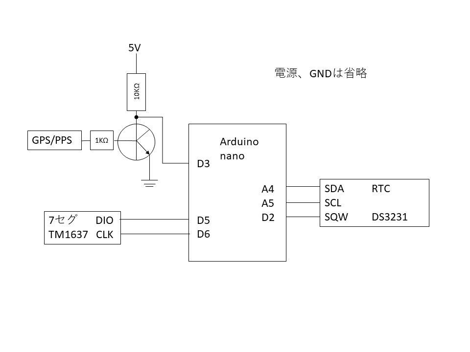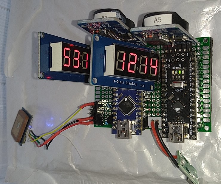 モニターしてみるときれいなパルスが出ている、、が電圧が低いのでトランジスタでしゃっきりさせてarduino nanoの割込みポートへ。一方のRTCからもSQWという端子からPPSが出ているのでそちらも割込みへ。双方の割込み時の micros() を比較し、差を7セグ表示機(TM1637)に表示。一度に2つチェックできるようにnanoを二つ並べGPS信号は共用した。