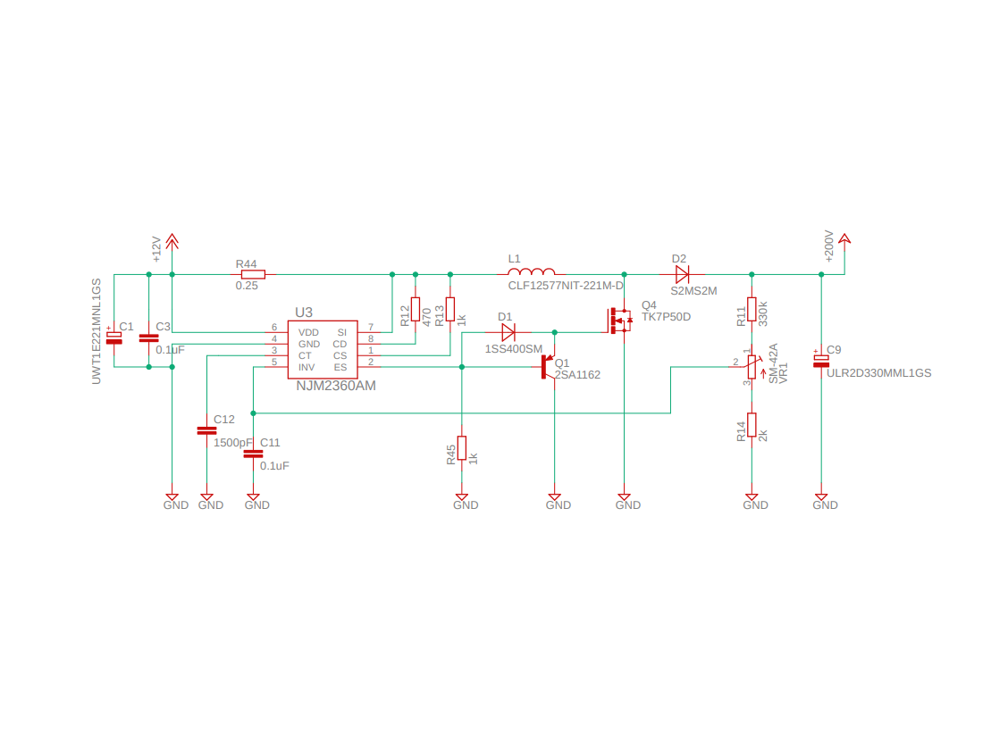 普通のチョッパ昇圧です."NJM2360 ニキシー管"とかで検索すれば死ぬほど例が出てきますので説明は要らないかと思います.今回はすべてリフローしたかったので,表面実装部品ですべて構成しました.