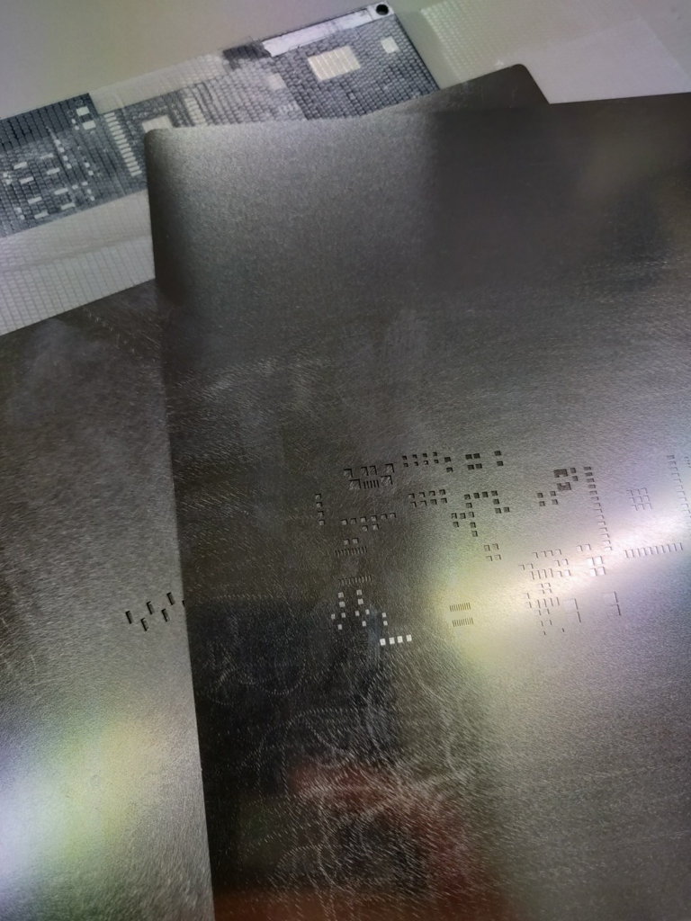 上の写真のようなステンシルと呼ばれるはんだペーストを塗るときの型紙みたいなものがあります.これを使ってはんだペーストを基板の上に塗ります.
