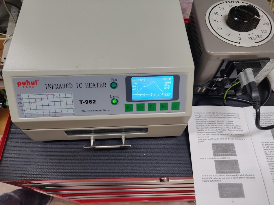 部品を乗せ終わった基板を110Vでしかうまくリフローできないリフロー炉に入れて,加熱します.