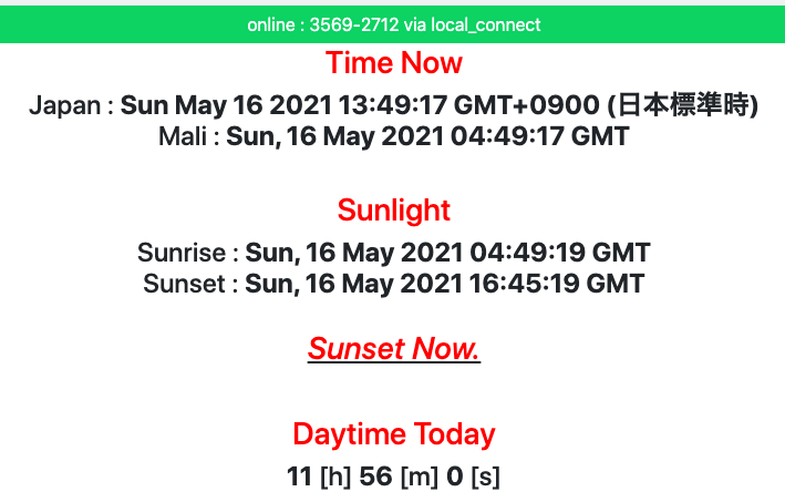 日本とマリ共和国の現在時刻は,javascriptのDateオブジェクトを使って出力しています.ちなみに,マリ共和国のタイムゾーンはUTC+0なので計算が楽で助かりました.